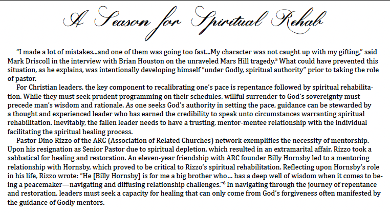 Posted on October 27, 2025 SHARE: [By William Vanderbloemen, 2015] Priorities and the Sabbath “But if He says that first He made the formless creation, and then that with form, His position is not absurd—not at least if He is capable of distinguishing priority in eternity, priority in time, priority in preference, priority in origin.”1 – St. Augustine From the beginning in Genesis, to Jesus’ life and teachings, to John’s witness of the Revelation, Scriptures depict an aspect of God’s orderliness in His priority and pace. In Ecclesiastes 3:11 (NASB), we are reminded that “(God) has made everything appropriate in its time. He has also set eternity in their heart, yet so that man will not find out the work which God has done from the beginning even to the end.” Different seasons, we are told, are appropriate for each created thing and living being. This faculty of created order is not lost in God’s created image of man. Billy Graham’s consistency in ministry throughout the years can be attributed to the recognition of this necessity – for he would have known what pace was appropriate for him. The lessons one may draw from how Graham stewarded his ministry over a long period of time extend far beyond the ministry itself. The Western Christian is familiar with the apostle Paul’s rhetoric, to “run in such a way that you may win” (1 Corinthians 9:24). Many turn to it when they need to ‘sprint out of the gates’, and reference it when they talk about finishing strong. Regrettably, one sees few who run the entire race well. The author’s professional practice involves helping faithbased organizations staff with the right talents. It has consulted with many organizations that are in the wake of a sudden departure of a leader who failed to adequately set the pace. In nearly every such situation the person involved exudes a feeling of exhaustion, and in many involving moral deficiency, they demonstrate a deteriorating spirit, focus, and energy towards their own leadership positions. These case studies lead us to conclude that weary leaders are prone to making poor decisions. The experience of fatigue in ministry known as “burn-out” often facilitates an atmosphere for temptations. Lance Witt writes in his book Replenish that fatigue creates a sense of disillusionment and depression, depriving one of motivations to fulfill the purpose of that role.2 Once a failure has occurred, the natural response is to attempt a contrived resolution, often due to pride on the part of the leader. The healthiest response, however, is often to relinquish one’s duties, if only temporarily, for the purpose of replenishing the lost energy or focus; and for those who failed moral challenges, a time of spiritual rehab (see Spiritual Rehab box). That may require taking responsibilities in a different arena or with a pay reduction. The wise and humble will take the necessary steps to achieve a long-term win. As often is the case, a leader has the greatest potential for success when he or she is healthy—spiritually, emotionally, and physically. The author’s professional experience also witnesses that the healthiest rest periods are often supervised ones such as sabbaticals, that are held accountable by others in leadership. Since people heal at different rates, there is no golden rule for how long a person must “sit out” in the wake of a failure. Rather, those who return healthy tend to look to others to help them know if, and when, to re-enter a leadership position. Ensuring a clear plan is in place for a supervisory counselor, board, or family member to help the Christian leader know when proper healing has occurred is mandatory. What sets Christian leaders apart in this area is maintaining a steady, manageable pace appropriate to that person. The Fourth Commandment provides the ultimate foundation to a healthy pace for sustainable leadership — keeping the Sabbath. Although emphasized throughout Scripture, Christian leaders often disregard the Sabbath principle, working many stress-filled hours, neglecting their own physical health and well-being of their family. Without a healthy pace or rhythm life can seem disorderly and debilitated. The Genesis account of God’s creation, above all else, depicts an image of God as Creator and God as Designer—organizing a world to facilitate order for a being created in His image. Part of that order is to be intentional about resting from work, reflecting on accomplishments and connecting with people. To be in His presence means to live within order, as lacking a healthy pace is to be “formless”, just like the earth before the Spirit hovered over it. As Lynne M. Baab states, “A rhythm allowing time for rest is essential to perceiving the forward movement of time toward God’s fulfillment of all things.”3 Principles for Stewarding a Healthy Pace Plan Daily Facilitating a healthy pace for life would start by pacing each day, where a good beginning sets the stage. Every effective Christian leader has a disciplined morning routine. Best selling author Brennan Manning is credited with saying, “Quiet time with God is like manna from heaven. It comes daily, and it disappears with the dawn.”4 A healthy pace for each day originates with a healthy beginning of the day. Martin Luther said if he had a regular day, he would pray for an hour before going to work; if it would be really busy, he would pray for two. The older and, unfortunately, busier people get, the more they realize that devotional time must be the first thing done in the morning. While no one can claim perfection, each person has the capacity to establish those daily habits, that the first words uttered each morning would be prayers to the Savior, and that the first words they read each morning would be from the Word of God to focus their priorities on resting in Him. Plan Weekly Beyond setting goals for each day, healthy Christian leaders take time to evaluate each wee