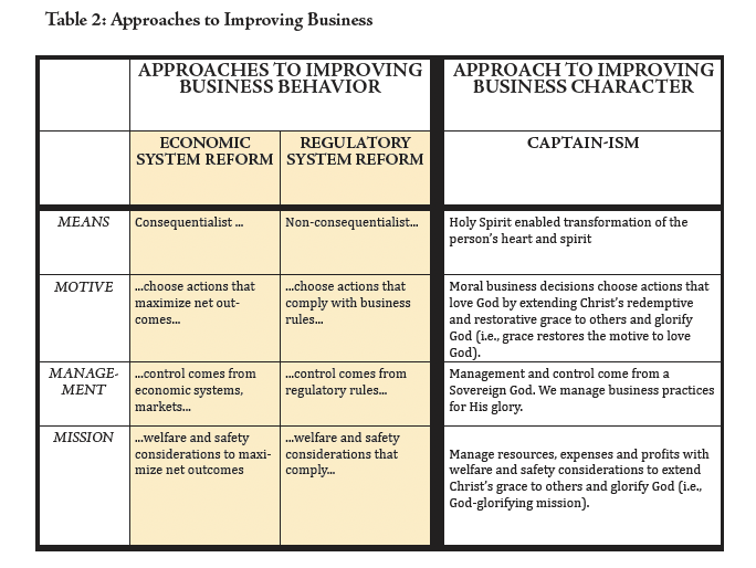Posted on November 17, 2025 SHARE: [By Marty Stuebs, 2017] Abstract The brokenness of business activity is deeper than a horizontal, societal problem of not following the right business rules. It involves a vertical, relational, spiritual problem of not following the right Ruler, God, that requires the spiritually redemptive and restorative work of the Trinity. Behind broken business practices are broken business people (Romans 7:14-25). This article unpacks a biblical approach to redeeming business that sees the transformation of business activity as a relational process. It begins with the vertical conversion of the human spirit by a loving God and ends in horizontal business activity and social change for the glory of God. The Need for Redemption and Restoration Corporate scandals reported daily in the Wall Street Journal reveal our business economy’s brokenness. In 2016, Mylan Pharmaceuticals unreasonably hiked the price of its lifesaving EpiPen allergy treatment, threatening customer welfare and safety. Wells Fargo was embroiled in a scandal where bank employees failed to protect customer financial welfare and safety by opening accounts without customer authorization. In 2015, Toshiba admitted to inflating fraudulently reported earnings over a seven-year period by $2 billion, jeopardizing the financial welfare and safety of potential investors and creditors. Volkswagen installed software on diesel-engine models to cheat on emissions tests designed to protect the welfare and safety of the environment. These examples illustrate specific applications of a more general ethical business challenge used throughout this article: how to balance the economic management of resources, expenses, and profits with the welfare and safety of customers, employees and other constituents. In each example cited, a business unreasonably sacrificed constituents’ welfare and safety in pursuit of increased economic gain. From an economic perspective, these activities are wrong because they lead to ineffective and inefficient risks and economic outcomes. From a legal perspective, these activities are wrong because they violate informal social norms and/or formal rules and laws. From a Christian perspective, these activities are wrong because they fail to love, honor and glorify God by using His resources to extend grace and love to others for His glory. Each of these perspectives views the brokenness differently. What then is needed to redeem this brokenness? The purpose of this essay is to recognize that redeeming and restoring business requires us to operationalize two rich realities of a Christian biblical blueprint for change: (1) an accurate diagnosis identifying the depth and severity of the brokenness of business, and (2) an adequate prescription recognizing the resulting necessity and power of the Trinity to transform the heart of business. The brokenness of business is deeper than a horizontal, societal problem of not following the right business rules and practices. It involves a vertical, relational, spiritual problem of not following the right Ruler—our God—that requires a personal, spiritually redemptive and restorative solution that only a perfect and loving Godhead can provide. This Gospel-centered approach to redeeming business most closely coincides with H. Richard Niebuhr’s conversionist approach and sees transformation of business activity as a relational process which begins with the conversion of the human spirit by a loving God and ends in business activity and social change for the glory of God.1 The Mess: How Broken is Business? A broken behavior problem Adequately prescribing a redemptive treatment first requires an accurate diagnosis. What is broken and in need of repair? Our society’s secular response sees the problem as a broken business behavior problem and prescribes economic and regulatory responses to improve business system incentives and rules to encourage and regulate right business activities. The Securities Acts of 1933 and 1934 were enacted after the crash of 1929 to reform the incentives and rules in our capitalist business system.2 The Sarbanes-Oxley Act of 2002 (SOX) modified the incentives and rules of business after a series of financial reporting frauds culminating with Enron and WorldCom.3 In response to the 2008 mortgage crisis and Great Recession, Congress passed the Dodd-Frank Act in 2010 to again improve and reform economic incentives and regulatory rules to improve business activities.4 After diagnosing the problem as a broken behavior problem, these approaches prescribe solutions that modify economic and regulatory systems to control, influence and reform business behavior. The use of economic system incentive reforms is guided by the logic underlying consequentialist (or teleological) moral perspectives like utilitarianism or egoism. Since consequentialist logic evaluates actions based on consequences, economic system reforms modify economic incentives and consequences to improve business actions. According to economic theory, economic incentives and market mechanisms are used as an “invisible hand” to guide and assure that individuals acting in their individual self-interests maximize society’s net outcome.5 Instead, the use of regulatory system reforms is guided by the logic underlying non-consequentialist (or deontological) perspectives like Kant’s categorical imperative. Since non-consequentialist logic views business ethics as a matter of understanding and applying certain imperatives or rules to guide actions, regulatory system reforms modify the rules governing business to improve business practice.6 The brokenness of business involves a vertical, relational, spiritual problem of not following the right Ruler—our God. Returning to the general ethical business challenge, these economic and regulatory system reforms are intended to aid business management of resources, expenses, and profits balanced with the welfare and safety of 