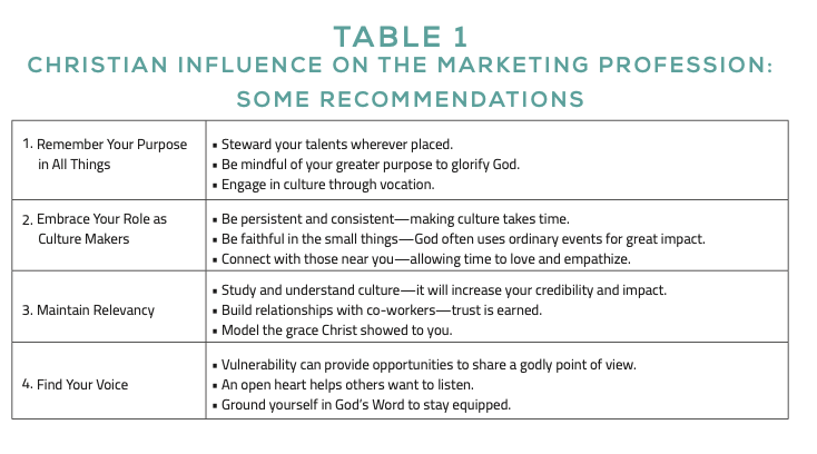 Christian marketers today have the same challenges to consider as their non-Christian peers. They must find the right customers, engage their interest, and encourage them to buy—or buy into—their ideas and product promises. They must be clever and creative and work tirelessly to advance the mission of the workplace they chose to enter. Yet they have another mission to advance. They must find relevant and appropriate ways to share their faith and advance their eternal mission. They must try to influence mainstream culture instead of avoiding the tough conversations. In this essay, we have suggested a few ways to help Christians focus on such missions (see Table 1). As the marketplace continues to accelerate at breakneck speeds, Christian marketers must find the strength and wisdom to share their views and show the world (and their peers) how Christians remain relevant in a complex world. They must be reminded of Jesus’ persuasion tactics and find ways to leverage them in their own stories both inside and outside the workplace. Marketing isn’t going away any time soon. If anything, it’s becoming more influential. May Christian marketers find the wisdom and creativity to keep advancing the kingdom mandate daily.