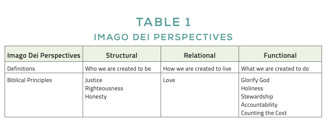 In the remainder of this paper, we apply the three perspectives on imago Dei to create a framework for how accountants can practice their profession in a way that mirrors their Creator and, therefore, brings glory to Him. Table 2 below summarizes the three perspectives and the biblical principles relevant to each.
