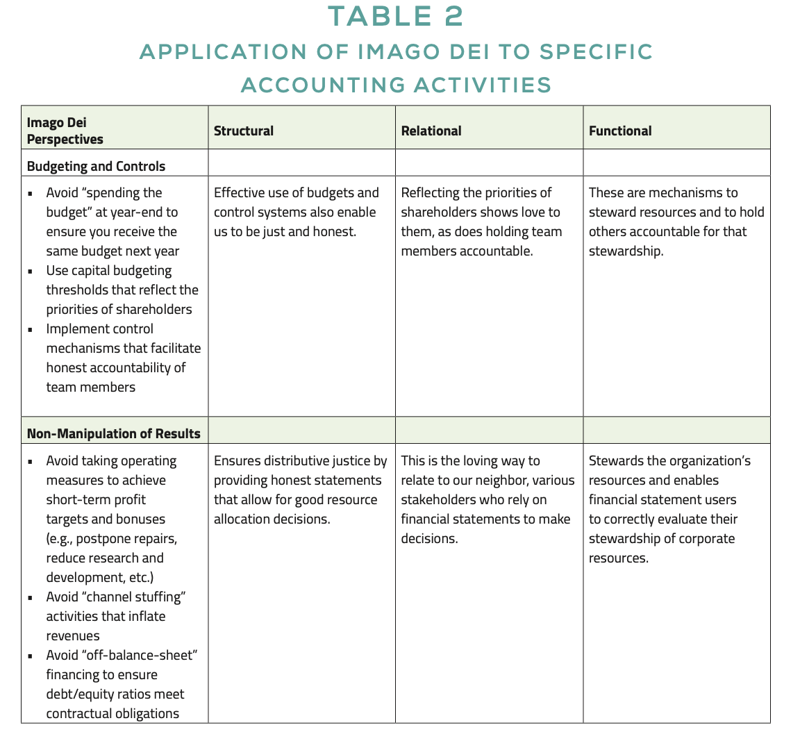 Although we have discussed the three perspectives separately in previous sections, Table 2 shows that practicing accounting in a way that truly and fully reflects what it means to be image bearers of God requires an integration of the three perspectives. The table provides an illustration of how the three imago Dei perspectives can be applied to specific accounting activities. It uses examples discussed in the preceding text and introduces other examples as well.