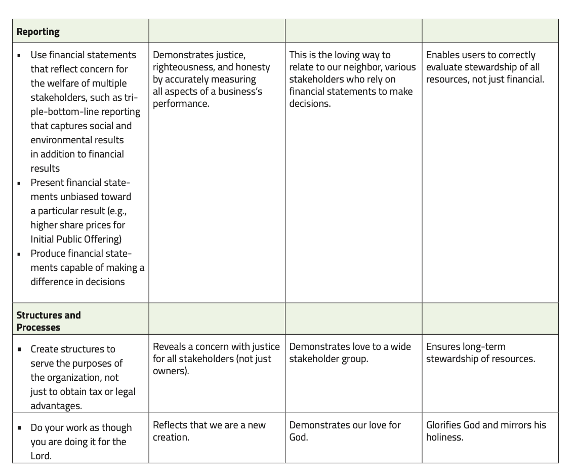A free-market economy relies heavily on ethics (standards of conduct by which actions are judged as right or wrong) and on contract law (which requires people to “make good on” business promises). Accounting relies, in part, on the ethical behavior of managers and accountants to prepare financial statements that fairly present what has transpired in the business. Financial reports also help users evaluate how ethically managers operate their business. For instance, do they repay debts on time, pay employees a fair wage, avoid unnecessary product recalls by spending appropriate amounts on quality, etc. Financial statements play an important role in facilitating contracts between managers (on behalf of businesses) and shareholders, creditors, employees, distributors, suppliers, etc. For example, financial statements that reflect concern for all stakeholders enable the bank to verify the company is not borrowing too much from other sources; help unions to determine what the business can afford in terms of wage increases; and substantiate sales upon which royalties are due, etc. Table 2 illustrates how such financial statements are also consistent with the relational and functional perspectives of the imago Dei.