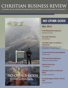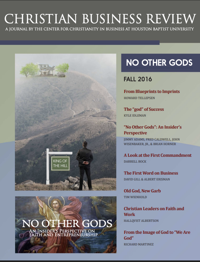 Issue 5: No other gods (Fall 2016) Please click individual articles below. Living Cases: From Blueprints to Imprints By Howard Tellepsen The “god” of Success By Kyle Idleman “No Other Gods”: An Insider’s Perspective By Jimmy Adams, Fred Caldwell, John Wisenbaker, Jr.,& Brian Horner (moderator) A Look at the First Commandment By Darrell Bock The First Word on Business By David Gill & Albert Erisman Old God, New Garb By Tim Wienhold Christian Leaders on Faith and Work By Hallqvist Albertson From the Image of God to “We Are God” By Richard Martinez Acknowledgments PUBLISHERS Robert B. Sloan, Jr. Michael Weeks EDITORS Ernest Liang CONTRIBUTING EDITORS Richard Martinez Darrell Bock REVIEW BOARD (2014-2016) Kevin Brown, Asbury University Michael Cafferky, Southern Adventist University David Cowan, Boston College David Gill, Gorden-Conwell Theological Seminary Jessie George, University of Houston – Downtown Leslie Haugen, Houston Baptist University (retired) Wallace Henley, Second Baptist Church, Houston Walton Padelford, Union University Yvonne Smith, University of La Verne The Christian Business Review, Issue 5. Copyright 2016 Houston Baptist University. All rights reserved by original authors except as noted. Submissions to this journal are welcome. Email us at cbr@hbu.edu. To learn about the Center for Christianity in Business, please visit www.hbu.edu/ccb. Library of Congress Cataloging Data Christian business review (Print) ISSN 2334-2862 Christian business review (Online) (www.hbu.edu/cbrj) ISSN 2334-2854 DISCLAIMER The views expressed in the articles or commentaries in this publication are solely the authors’ and do not necessarily reflect the views and opinions of the Christian Business Review, Houston Christian University (HCU), the HCU Archie W. Dunham College of Business, or the Center for Christianity in Business. CENTER FOR CHRISTIANITY IN BUSINESS MISSION The mission of the CCB is to equip and encourage leaders to carry their faith into organizations by developing and delivering a distinctively Christian worldview for business. INITIATIVES RESEARCH Consulting Engagements Scholarly Journals Research Seminars and Symposia Resident Scholars Program For Faith and Business Research COMMUNICATION Speaker Series Christian Business Leadership Video Series Christianity in Business Podcast and Live Webinar Series EDUCATION Annual Mentoring Conference Executive Education Programs
