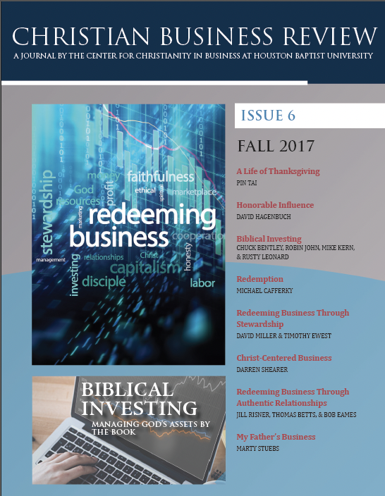 Issue 6: Redeeming Business (Fall 2017) Please click individual articles below. Living Cases: A Life of Thanksgiving By Pin Tai Honorable Influence By David Hagenbuch Biblical Investing: Managing God’s Assets by the Book By Chuck Bentley (moderator), Robin John, Mike Kern, and Rusty Leonard Redemption By Michael Cafferky Redeeming Business through Stewardship By David Miller and Timothy Ewest Christ-Centered Business: Disciple-Making in the Midst of Profit-Making By Darren Shearer Redeeming Business Through Authentic Relationships By Jill Risner, Thomas Betts, and Bob Eams My Father’s Business: From Capitalism to Captain-ism with Christ By Marty Stuebs Acknowledgments PUBLISHERS Robert B. Sloan, Jr. Michael Weeks EDITORS Ernest Liang CONTRIBUTING EDITORS Richard Martinez Darrell Bock REVIEW BOARD (2015-2017) Kevin Brown, Asbury University Michael Cafferky, Southern Adventist University John Cragin, Oklahoma Baptist University David Cowan, Boston College David Gill, Gorden-Conwell Theological Seminary Gregory Keiffer, Houston Baptist University Walton Padelford, Union University Yvonne Smith, University of La Verne Kenman Wong, Seattle Pacific University The Christian Business Review, Issue 6. Copyright 2017 Houston Baptist University. All rights reserved by original authors except as noted. Submissions to this journal are welcome. Email us at cbr@hbu.edu. To learn about the Center for Christianity in Business, please visit www.hbu.edu/ccb. Library of Congress Cataloging Data Christian business review (Print) ISSN 2334-2862 Christian business review (Online) (www.hbu.edu/cbrj) ISSN 2334-2854 DISCLAIMER The views expressed in the articles or commentaries in this publication are solely the authors’ and do not necessarily reflect the views and opinions of the Christian Business Review, Houston Christian University (HCU), the HCU Archie W. Dunham College of Business, or the Center for Christianity in Business. CENTER FOR CHRISTIANITY IN BUSINESS MISSION The mission of the CCB is to equip and encourage leaders to carry their faith into organizations by developing and delivering a distinctively Christian worldview for business. INITIATIVES RESEARCH Consulting Engagements Scholarly Journals Research Seminars and Symposia Resident Scholars Program For Faith and Business Research COMMUNICATION Speaker Series Christian Business Leadership Video Series Christianity in Business Podcast and Live Webinar Series EDUCATION Annual Mentoring Conference Executive Education Programs
