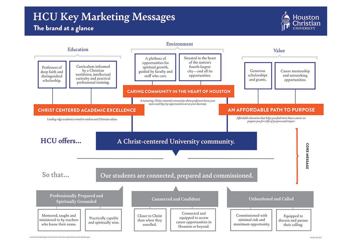 The brand at a glance. Education: Christ Centered Academic Excellence Leading-edge academics rooted in wisdom and Christian values. Professors of deep faith and distinguished scholarship. Curriculum informed by a Christian worldview, intellectual curiosity and practical professional training. Environment: Caring Community in the Heart of Houston A nurturing, Christ-centered community where professors know your name and big city opportunities are at your doorstep. A plethora of opportunities for spiritual growth, guided by faculty and staff who care. Situated in the heart of the nation’s fourth-largest city —and all its opportunities. Value: An Affordable Path to Purpose Affordable education that helps you find more than a career: we prepare you for a life of purpose and impact. Generous scholarships and grants. Career mentorship and networking opportunities. View Key Messages PDF