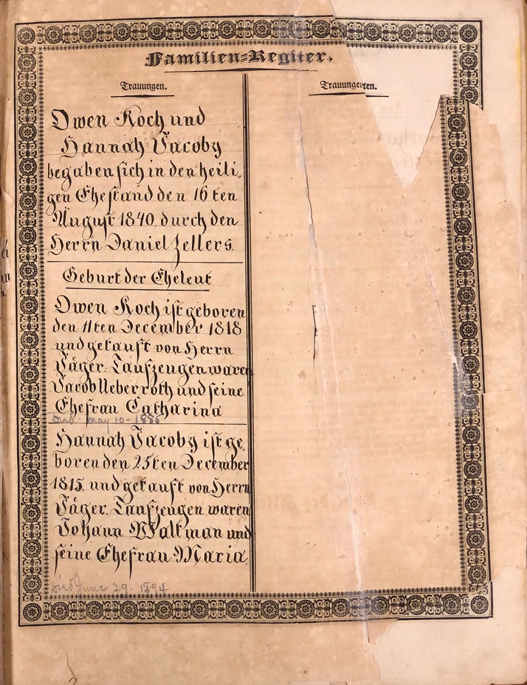 - Owen Koch to Hannah Jacoby. August 10, 1840. By Rev. Daniel Zellers.