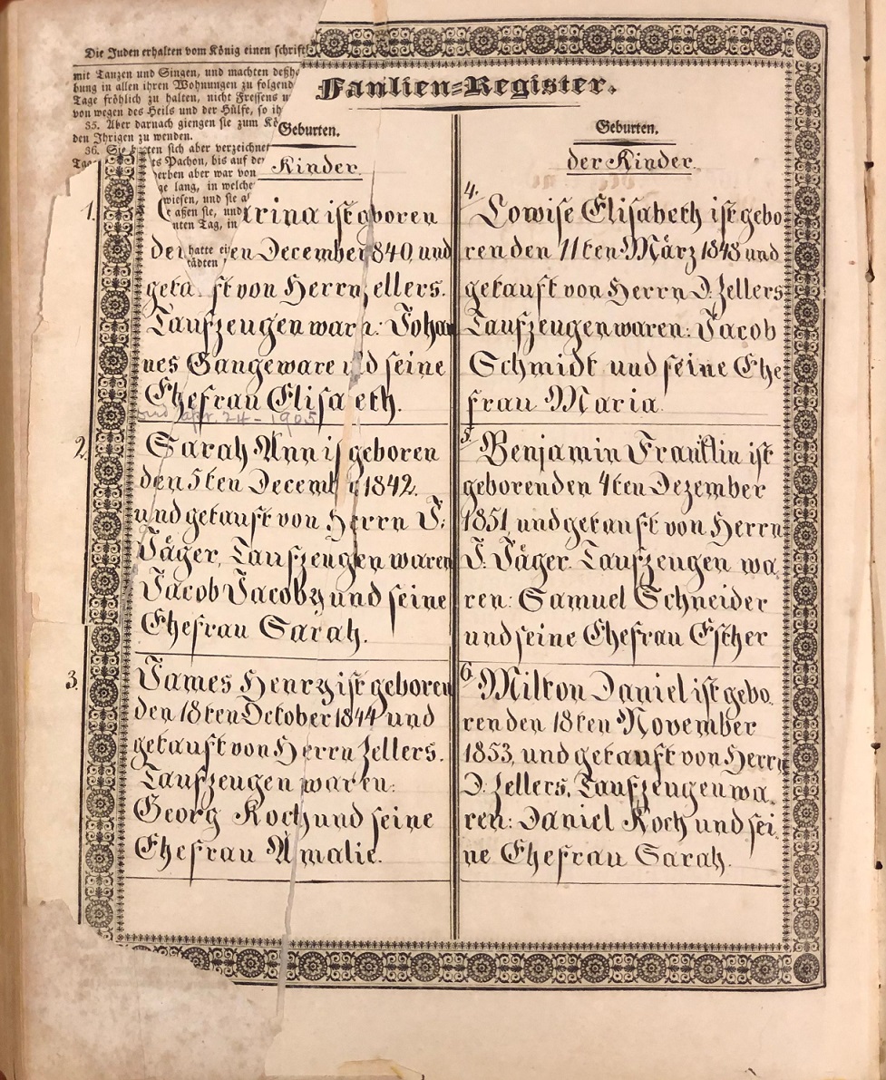 - Lowise [sic] Elizabeth. March 11, 1848. Godparents at baptism were Jacob Schmidt and his wife Maria.