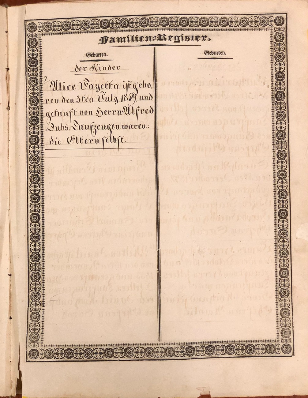 - Alice Fayetta. July 10, 1859. Baptized by Mr. Alfred Dubs. Godparents at her baptism were her parents.