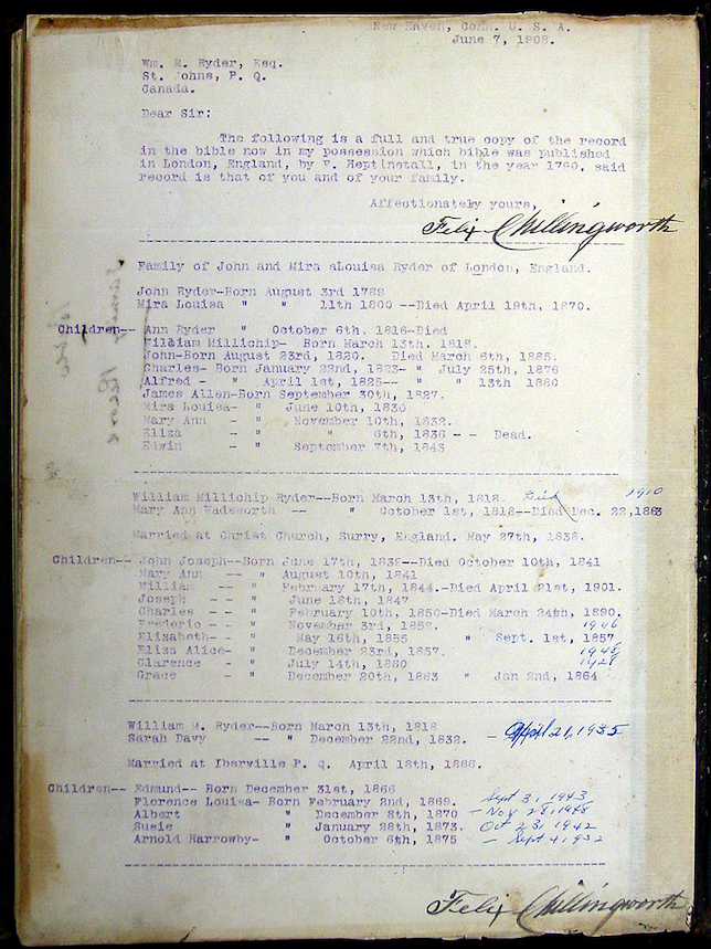 (Top of record page) Felix Chillingworth writes to William. Millichip Ryder, Esq. to provide Ryder family genealogy information from a 1790 Bible in Chillingworth’s possession. Sent June 7, 1908.