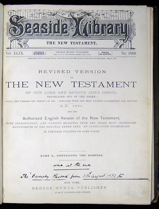 1881 New Testament, published by George Munro, New York