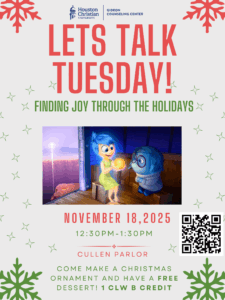 Finding Joy Through the Holidays November 18 @ 12:30 p.m. - 1:30 p.m. Come take a study break, create a Christmas ornament, and talk about ways to find joy, create memories, and maintain wellness through the holidays. Students can enjoy refreshments and earn 1 CLW-B credit for attendance. Add to calendar Google Calendar iCalendar Outlook 365 Outlook Live Details Date: November 18 Time: 12:30 p.m. - 1:30 p.m. Venue Cullen Parlor + Google Map Organizer Gideon Institute of Christian Psychology and Counseling Phone (281) 649-3000 Email gideon@hc.edu View Organizer Website « All Events